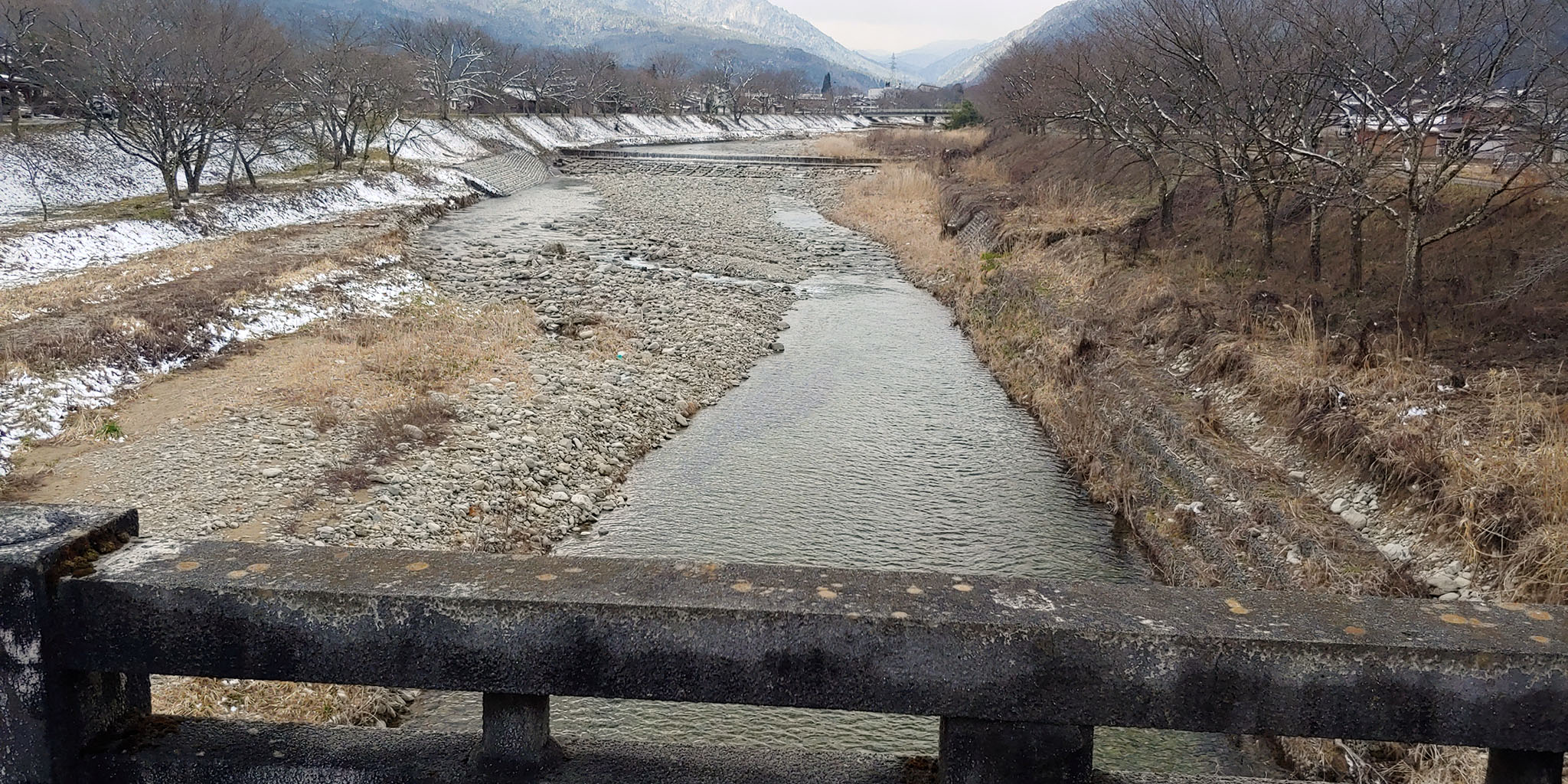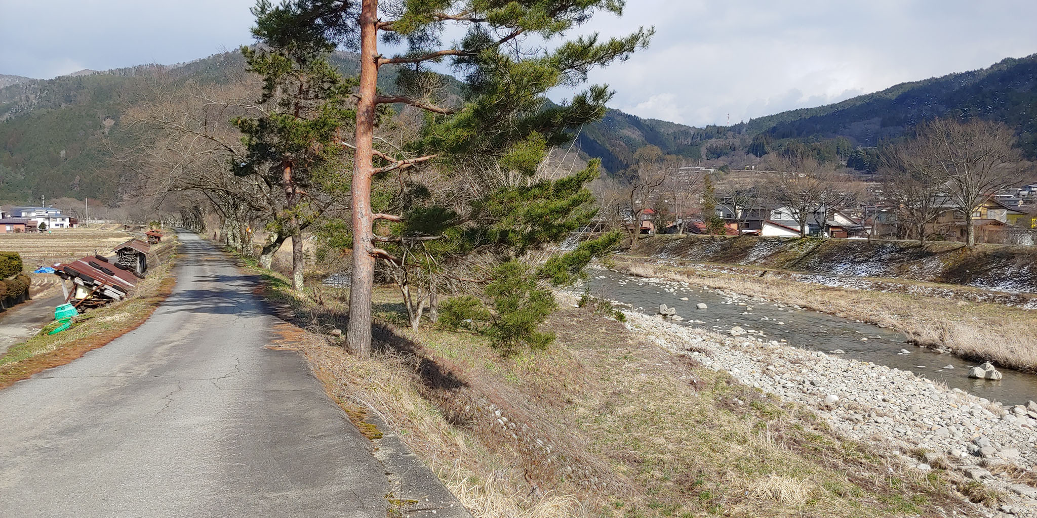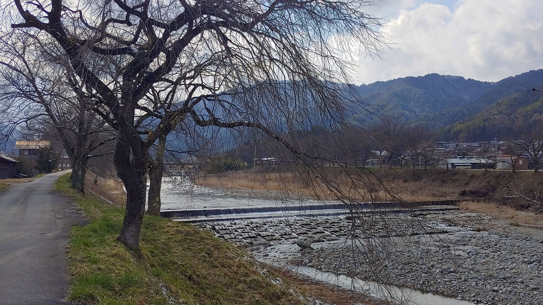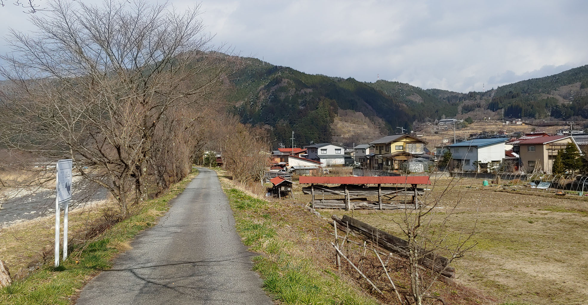 그 다리를 지난뒤의 강변의 길을 들어서면 벚나무가 가득합니다! 상당한 이상기온으로 벚꽃이 이키비나 축제할 때쯤 펴서 이쪽길로 행렬이 이동했다면 그 자체로 그림이 되라라 의심치 않을 벚나무 터널입니다. 빙과에서 굳이 이 길로 유도했던 그 금발의 기분이 이해가 되네요. 지금이야 앙상하지만 벚꽃이 필때의 광경을 상상하니 차라리 이키비나 축제를 뒤로 미루면 안 되나 하는 생각까지 듭니다.