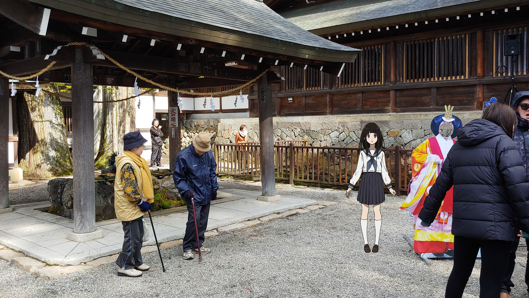 참 그러고 보니 무대탐방이란 앱(https://play.google.com/store/apps/details?id=jp.linknetwork.anitrip&hl=ko)이 있어서 이렇게도 찍어보았습니다. GPS와 연동해서 맵에 각 배경의 위치를 띄워주고, 사진 찍을 때 애니메이션에서 나왔던 화면도 같이 보여주는 등 재미난 기능이 많아서 빙과 무대 탐방때는 요긴하게 사용했습니다. 이번 무대탐방 사진에는 이 AR 사진들을 올려볼까요?
