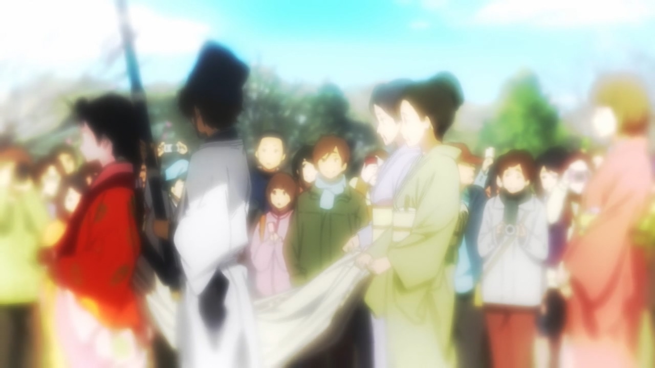빙과에선 양산을 드는 사람이 두 명이 있어 이키비나에 호타로가 붙어 갔습니다만 이번 행렬을 보니 앞에 오비나 역과 뒤에 어떤 남자 역에만 양산이 붙어 있습니다. 때문에 작중 호타로처럼 이키비나의 뒷덜미를 힐끔힐끔 쳐다볼 수는 없지요 ㅎㅎㅎ