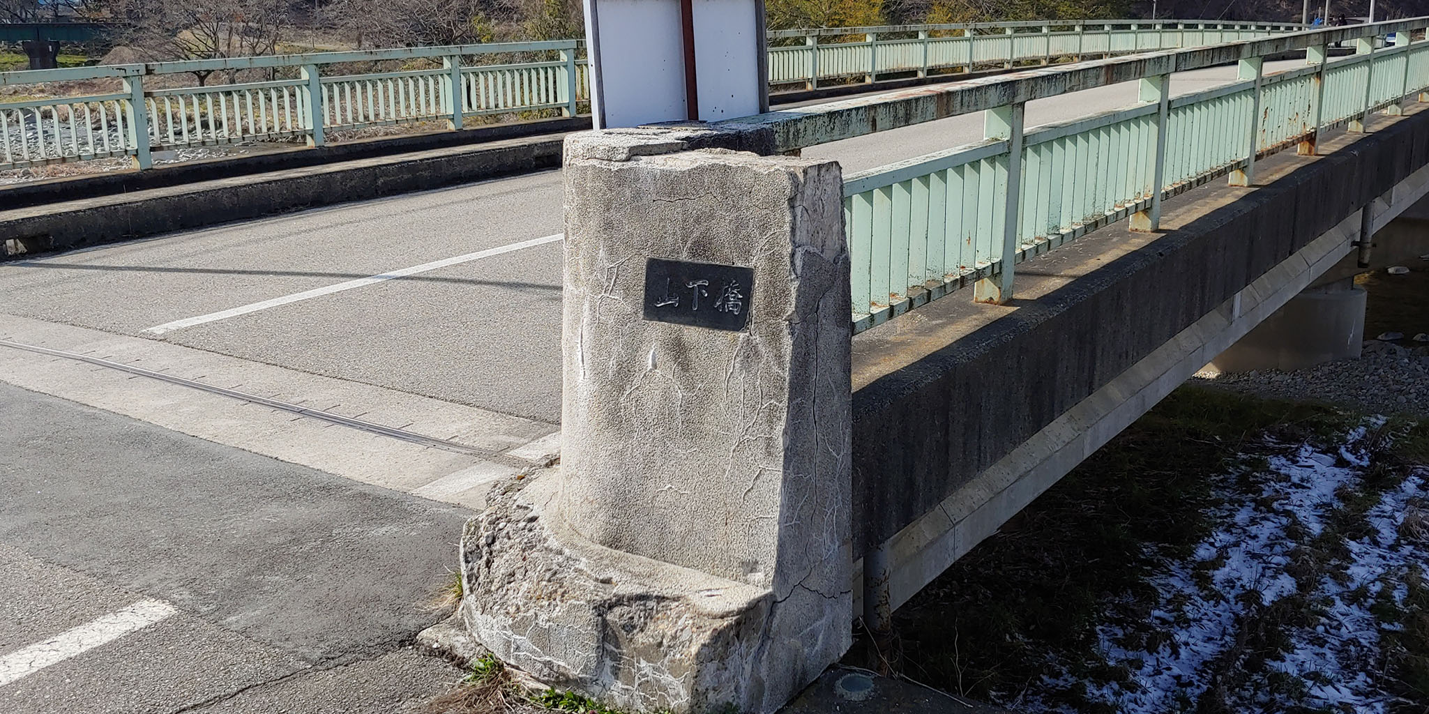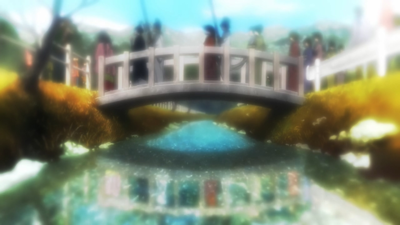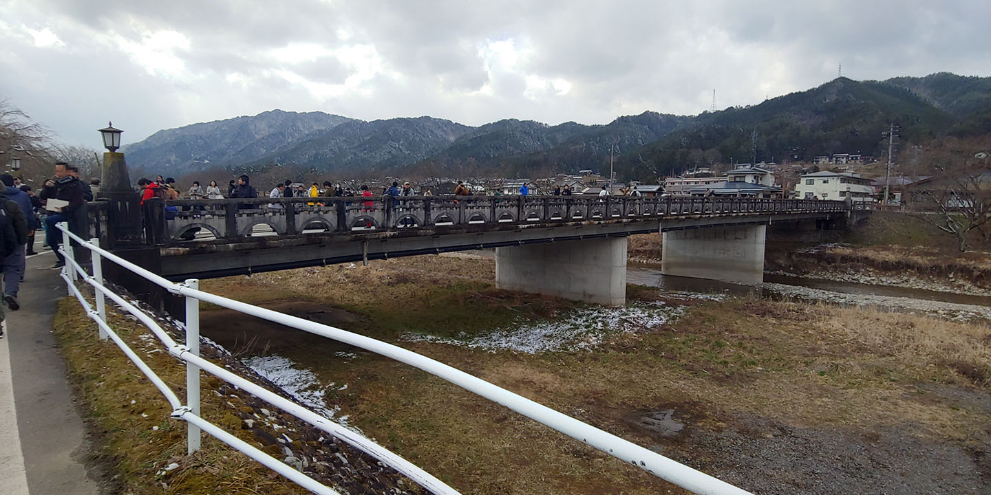 이게 그 빙과에서 공사 중이었던 것으로 나온 쵸큐교로 보이는 강을 건너는 다리에 행렬이 도착합니다. 다만 애니메이션을 본 머릿속 기억과 대조하니 빙과의 지형지물 묘사와 실제 지형은 꽤나 차이가 큽니다. 다리의 이름도 다르네요. 신사 이외엔 다 창작이라 봐도 무방할 정도.
