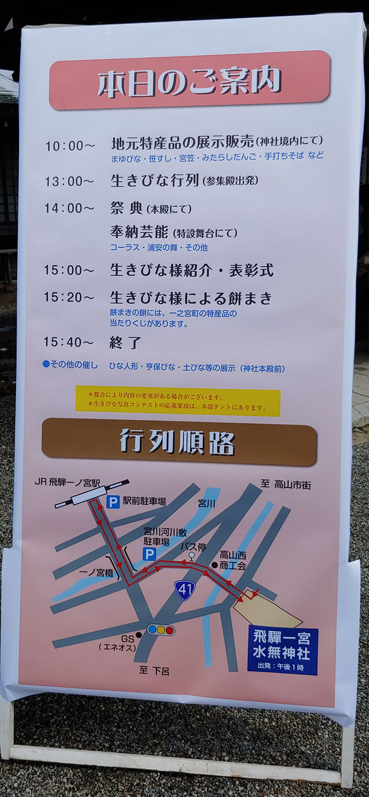 그런데 이 가까운 타카야마의 버스 터미널이나 JR기차역에서조차 딱히 이 히다이치노미야의 이키비나 축제에 대한 것은 포스터 한 장조차 보지 못 했습니다. 히나마츠리에 대한 내용은 간간히 보이긴 한데... 진짜 하긴 하는 건가? 불안감은 더해지고 있습니다.