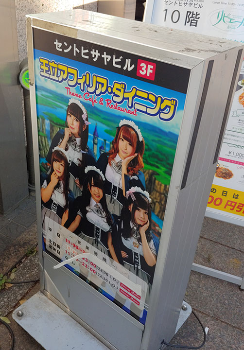 역으로 가는 길에 있던 메이드 카페 광고판. 메이드 카페에 가는 사람들이여 속지 말지어다. 어차피 요리는 안쪽에 계신 분들이 하리니. 모에모에 뀽! 전 애기븝미에양! 맛있어져랑! 같은 거 하지 말고 걍 옷만 입고 서빙만 해주고 이쁜 옷 구경이나 하는 곳이라면 환영인데 말이죠. 전 항마력이 부족하니 딱히 이번 여행에서 갈 일은 없을 것 같습니다.