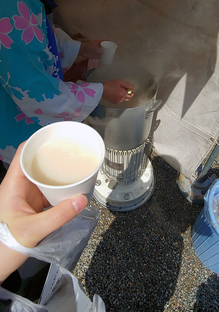 난로에서 끓이고 있는 감주를 하나 샀습니다. 아까 버스보다는 해가 나오긴 했어도 강한 바람에 나무 위에 쌓인 눈이 흩날릴 정도로 추워서 따뜻한 한 모금이 간절하네요.