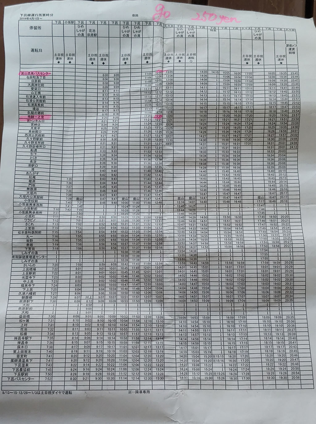 그렇게 멘붕 하다가 방금 있었던 버스터미널로 가서 안내원에게 물어보니 다행히 타카야마에서 게로 온천으로 가는 버스가 있는데 이 버스가 도중에 히다이치노미야를 들린다고 해주십니다. 버스 시간표를 주며 메인펜으로 표시도 해주심니다. 대략 1시간마다 하나씩 버스가 있는데 다행히도 바로 다음에 12시 20분에 도착하는 버스가 있었습니다. 조금만 늦었다면 축제가 시작하고서야 갈 뻔했네요.