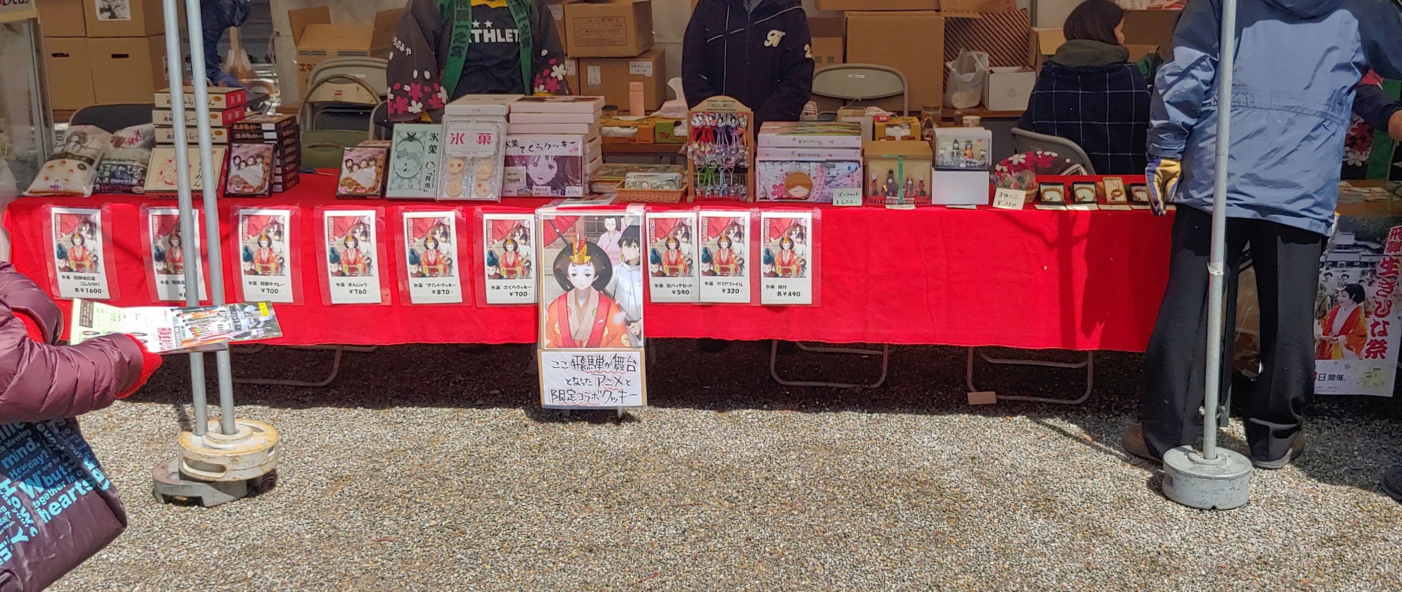 축제를 준비하는 사람들과... 어? 빙과 물건을 파는 가판대가 커다랗게 있습니다. 슬슬 잊혀지나 했는데 아직 하고 계셨군요. 하나밖에 남지 않은 빙과 문집이 그려진 만쥬와 이유는 몰라도 히다규가 포함된 인스턴트 카레 1인분을 집었습니다. 나머지는 빙과라고 적힌 쿠키와 무슨 천, SD화된 열쇠고리 등이 있습니다.