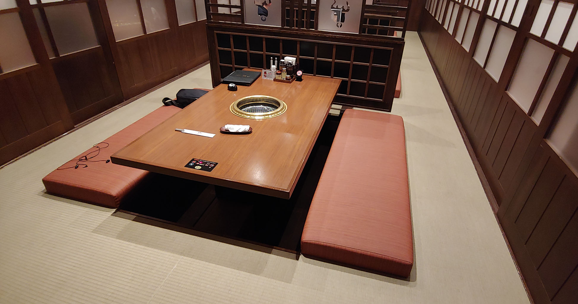 귀한 몸이니 일단 2점만 살그머니 올려 모든 신경을 집중해 굽기 시작합니다. 그동안 소고기 구워온 솜씨를 이때 발휘해야죠. 아래 연탄처럼 생겨먹은 구멍 아래 사실 가스불이 타고 있습니다. 보통 한국에서 볼 수 있는 위에서 내려오는 환풍기가 아니라 옆부분에 길쭉한 구멍들로 환풍이 되는데 이쪽이 굽기에 덜 불편해서 편하긴 하네요. 한국에선 가끔씩만 보입니다만 숯불은 더 연기가 많이 나기 때문에 힘든 거려나요? 아니면 제가 한국에서 고급 소고기집을 못 가 봐서 모르는 거겠죠 흑.