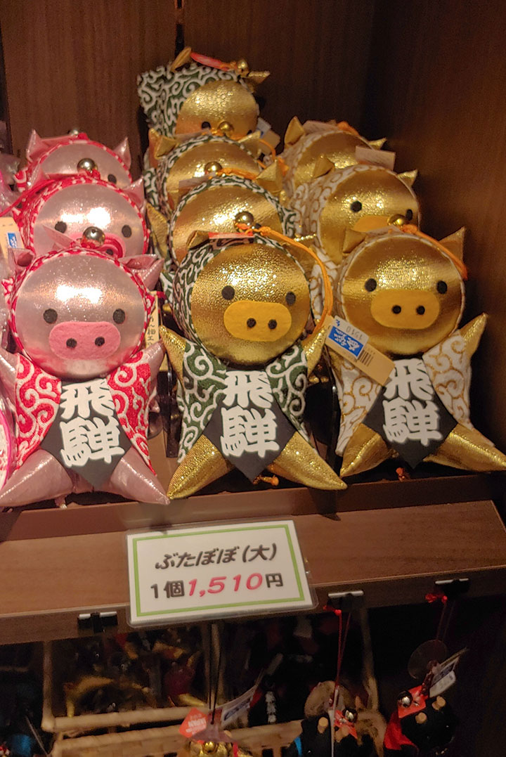 기다리는 동안 점내에 조그만하게 마련된 기념품들을 좀 구경할까요? 돼지해여서 그런지 몰라도 돼지모양의 귀여운 사루보보도 있습니다. 아는 사람 중에 돼지띠가 있으니 하나 사가긴 하는데 엄청 비쌉니다. 히다규 0.5~1인분 값이군요 흑.