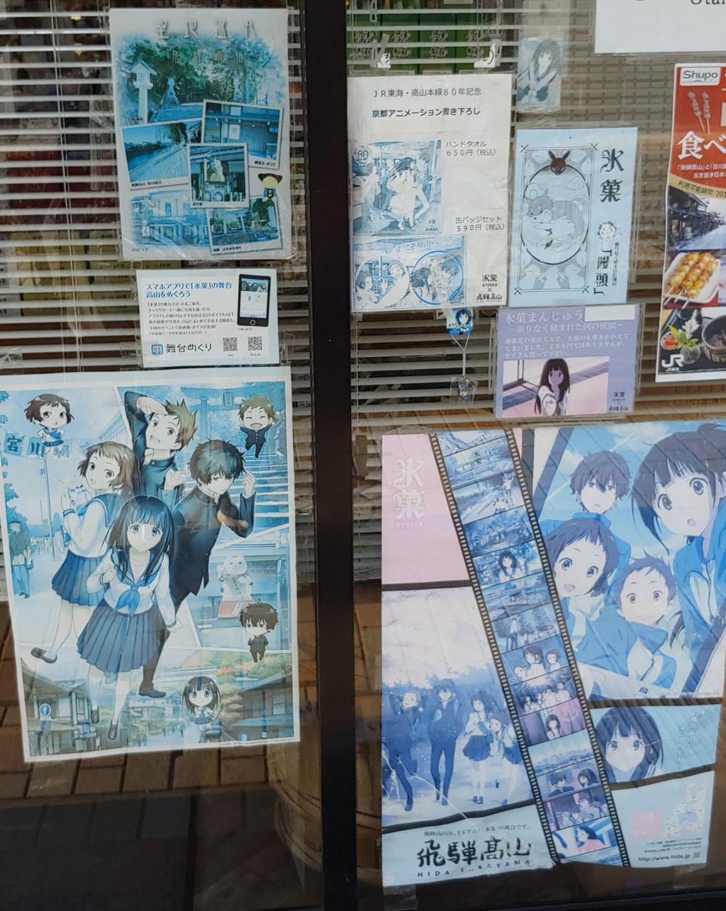 역을 나와 숙소로 가는 도중 반가운 포스터들이 있습니다. 왼쪽은 지금까지 썼던 무대탐방 앱 광고 포스토도 있네요. 빛바랜 포스터가 빙과 방영부터 시간이 꽤 지났음을 다시 한번 상기시켜줍니다.
