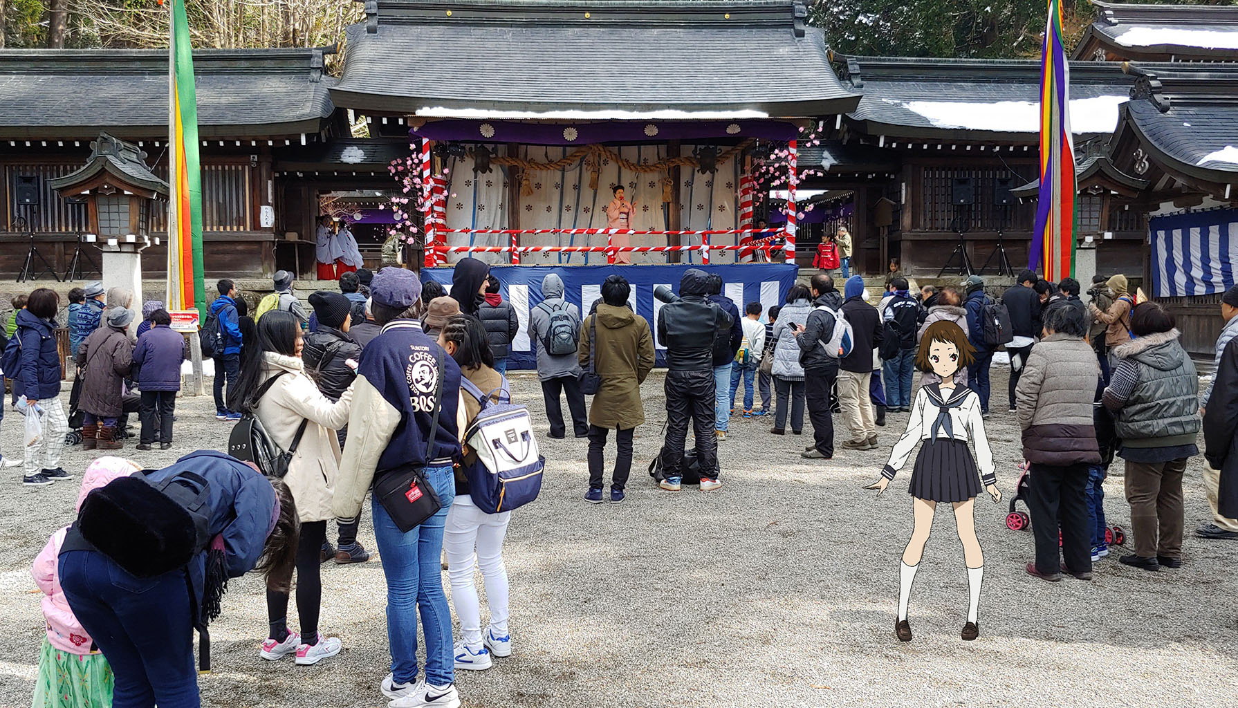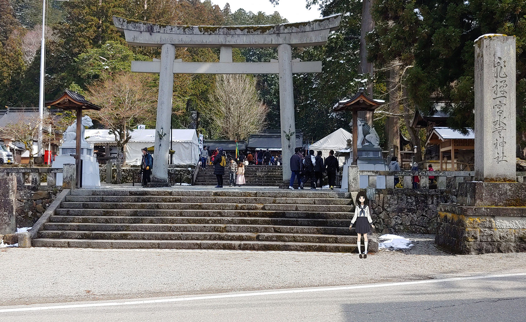 다른 한쪽에선 김이 모락모락 나는 온소바도 팔던데 차가운 주먹밥에 식은 돈지루를 먹다 보니 조금 부럽습니다. 이제 행렬 구경은 다 했으니 빙과 무대탐방 사진찍기를 시작합니다! 일단 신사부터겠네요.