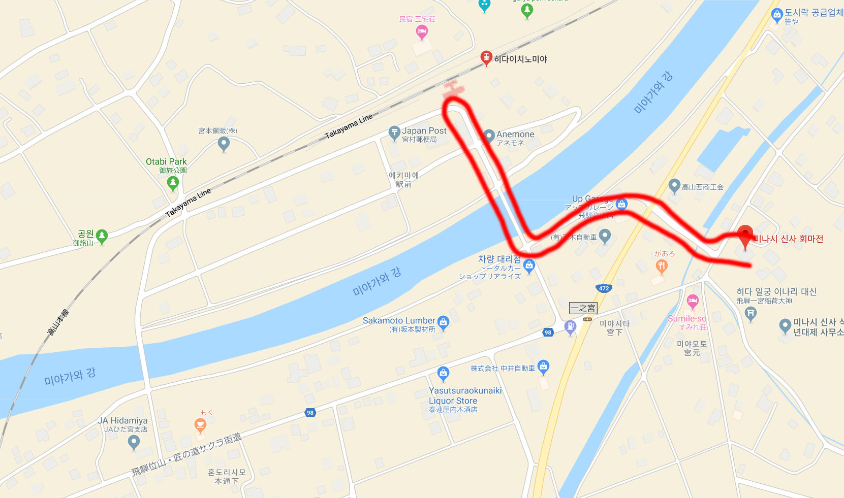 고속버스는 아니고 매 정류장마다 정차하며 가는 천천히 가는 마을버스지만 히다이치노미야가 그렇게 먼 곳은 아니기에 잠시 멍 때리면 금방 도착합니다. 시골이라 그런지는 몰라도 구글맵에 없는 경로로 더듬어 가니 묘하게 여행의 맛이 나기 시작합니다.