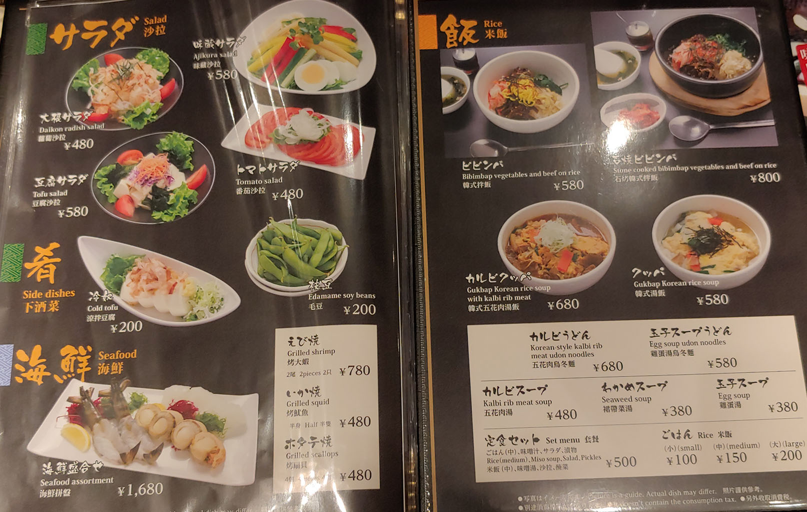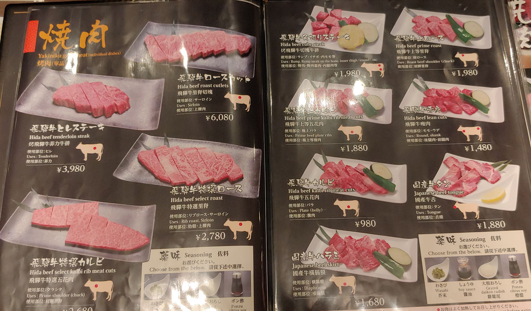 그냥 기다리긴 뭐하니 메뉴판을 보며 미리 뭘 먹을지 정합시다. 일본 3대 소고기 중 하나라는 히다규답게 가격도 자비 없습니다. 사진에서 보이는 마블링을 보니 오늘 기름칠은 단디 하겠네요. 이번 여행, 먹을 땐 먹기로 어제 정하긴 했는데 단품의 가격이 무자비하기도 하고 거기에 몇 g인지도 모르겠어서 대체 어느 정도나 먹어야 할지 가늠도 되질 않습니다. 한참 고민했는데 적절한 가격인 1인용 세트가 있어 그걸로 먹기로 하지요.