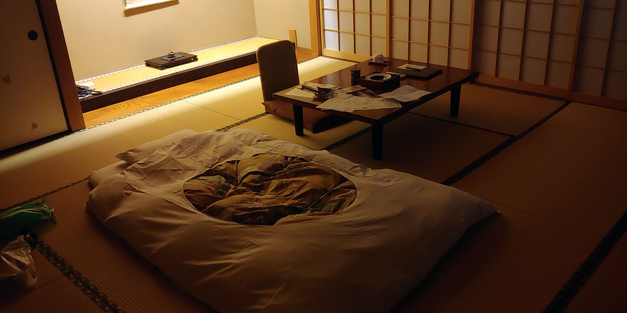 저녁 과식 후 돌아오니 펴져있는 이부자리에 바로 쓰러져 뒹굴거리다가 슬슬 잠에 들려는 참에 또 덜컹덜컹 소리가 나기 시작합니다. 보기엔 좋네요. 보기엔... 이후 자려고 할 때마다 자정 근처 막차까지 덜컹덜컹 소리가 나서 잠에 들지 못합니다. 그냥 일어나서 한번 더 온천에 몸을 담그고 오지요. 후으으...저번 여행 때 밤하늘 아래 노천탕에서 별을 올려다보는건 꽤나 운치있었기에 이번에도 기대했으나 아쉽게도 저녁쯤 구름이 몰려오는 바람에 별을 보이지 않습니다.