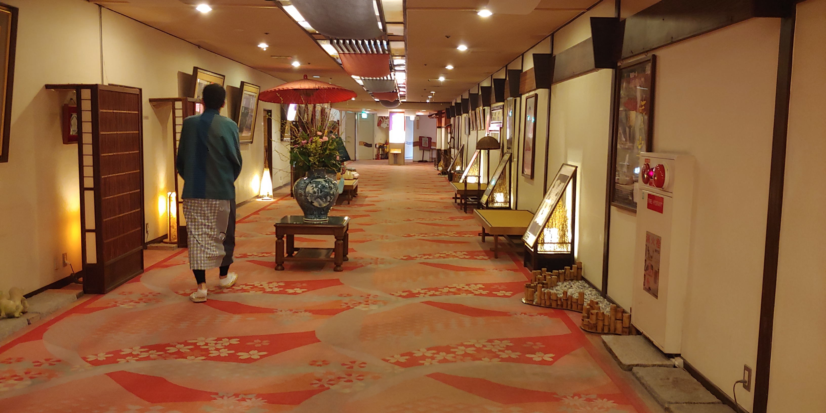목욕탕은 지하에 대욕탕이 하나 있습니다. 호텔료칸의 규모에 비해선 조금 작아보이는 욕탕과 노천탕이 하나씩 있죠. 저녁을 먹기 전에 한번 몸을 씻으러 갑시다. 아쉽게도 하루마다 여탕과 남탕이 바뀌는 기믹은 없나 보군요. 가는 도중에 온천탁구대가 있어 반가웠으나 이번에 같이 칠 사람은 없는 것은 조금 아쉽습니다. 온천은 평범했습니다. 특이할 점은 노천탕이 생각보다 약간 불안해질 정도로 바깥에 개방적이었다는 정도겠네요.