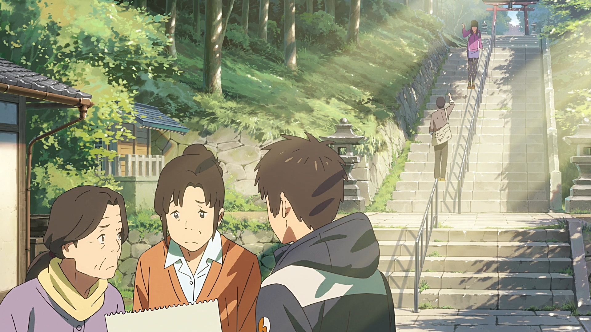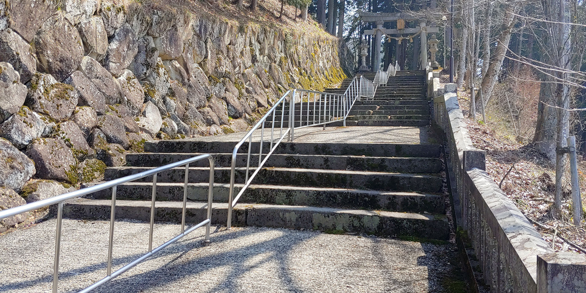 이 계단 때문에 여기까지 왔었죠. 아마도 신사의 딸이라는 것을 근거 삼아 여기에 타키가 물으러 오지 않았나 싶습니다. 단 3초동안 나온 장면때문에 여기까지 걸어오게 될 줄이야. 애니메이션과 실제 계단 사진은 꽤 다르게 생겼습니다. 아무래도 뒤쪽에 있는 저 두 사람의 알콩달콩한 계단 가위바위보를 위해 디자인을 좀 바꾸지 않았나 싶습니다.