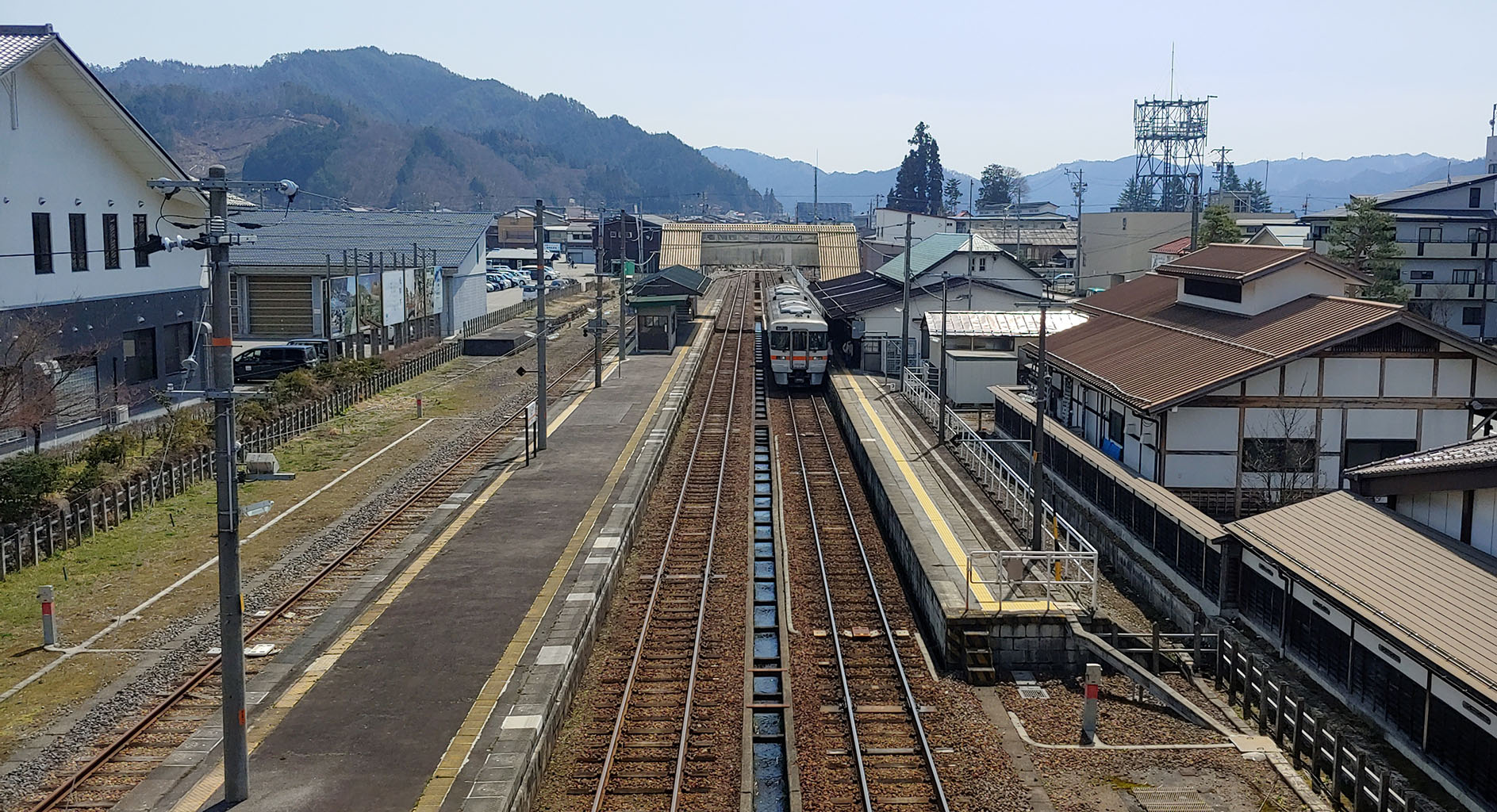 자! 여기로 너의 이름은 무대탐방의 스타트를 끊습니다! 히다후루카와 역에 도착해서 나온 뒤에 오른쪽으로 향하면 이 광경을 볼 수 있는 육교가 있습니다. 그저께 갔었던 히다이치노미야역보다는 조금 더 나은 시골 역이네요.