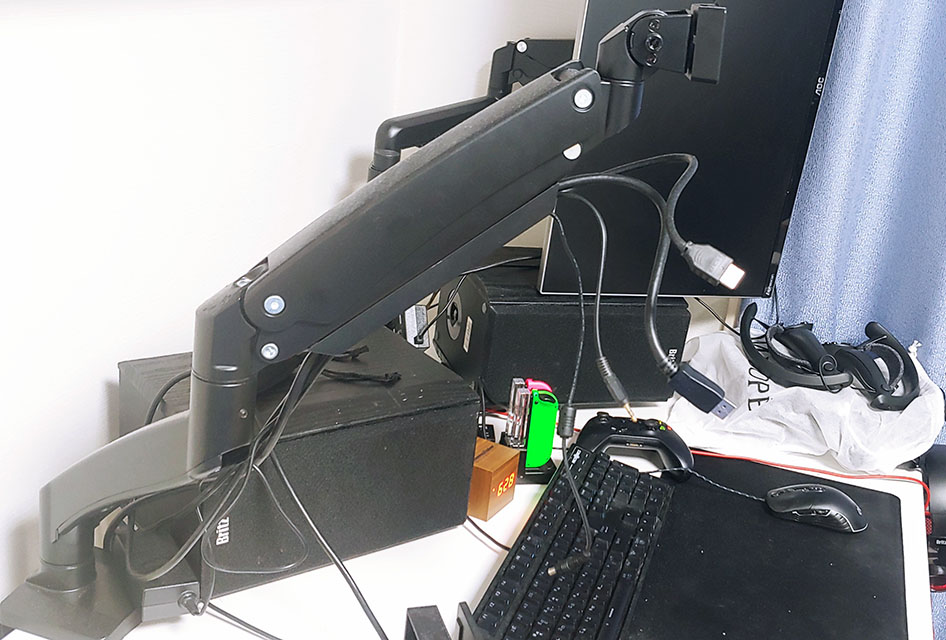 손쉽게 모니터암에 다는 데에 성공했습니다. 손으로 느껴지는 무게는 확실히 비슷한데, 커브모니터라 그런지 무게 중심이 좀 더 멀리 있어서 모니터암에 걸리는 하중은 조금 더 추가되는 모양이네요. 예전보다 장력을 반바퀴정도 더 감아주니 안정적으로 설치 가능했습니다.