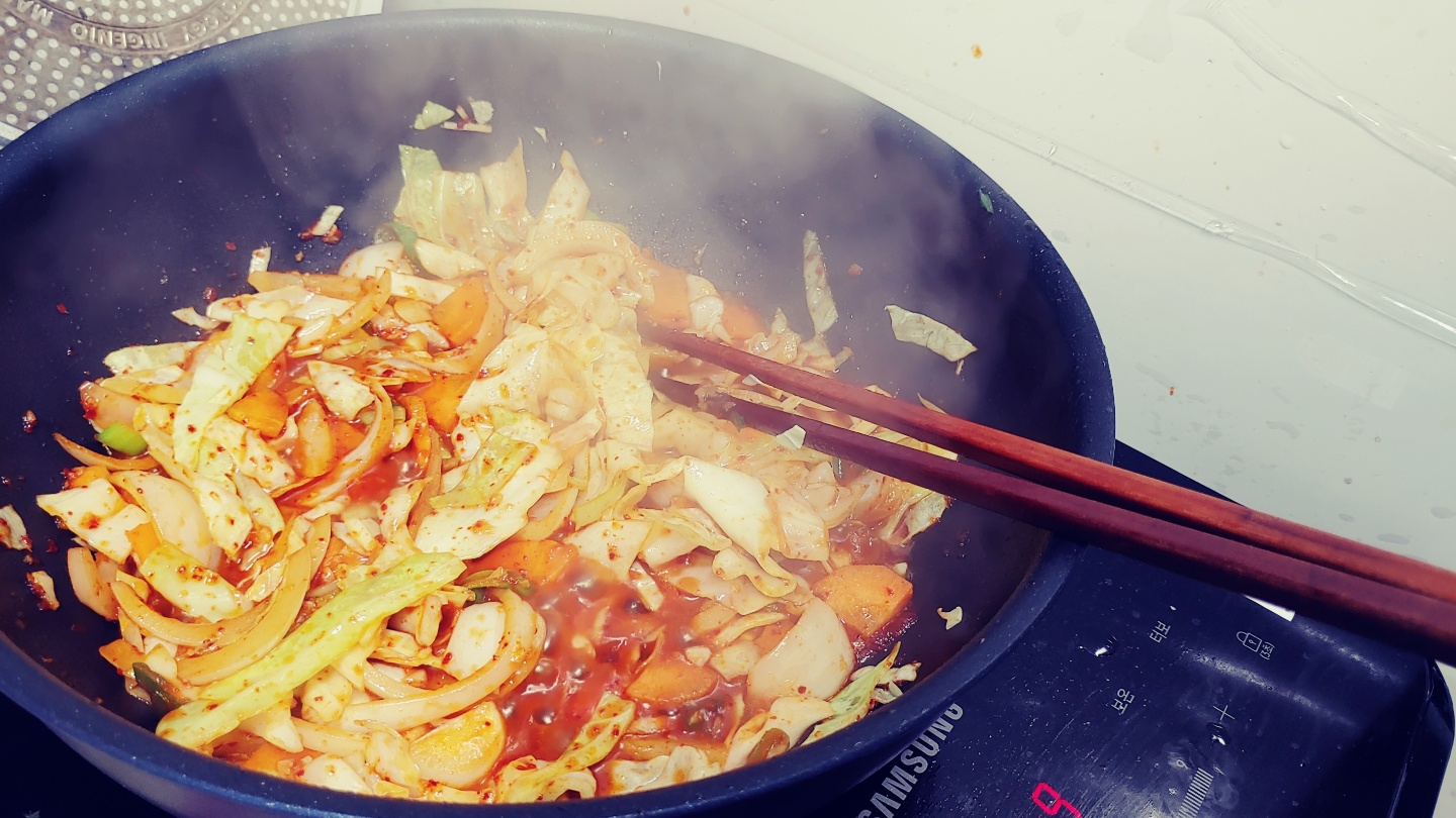 인덕션 한구로 가지밥과 낙지볶음에 소면도 곁들이니 시간이 사라지네요.
